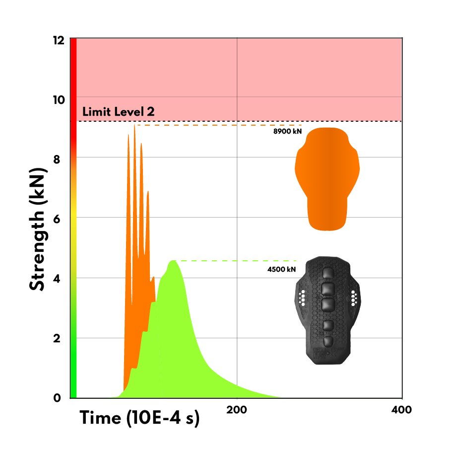 Los resultados del comparativo de soluciones de protección son claros: nuestra solución mejora el rendimiento por un factor de 2 y reduce la desaceleración por un factor de 3, un criterio esencial para minimizar las lesiones.